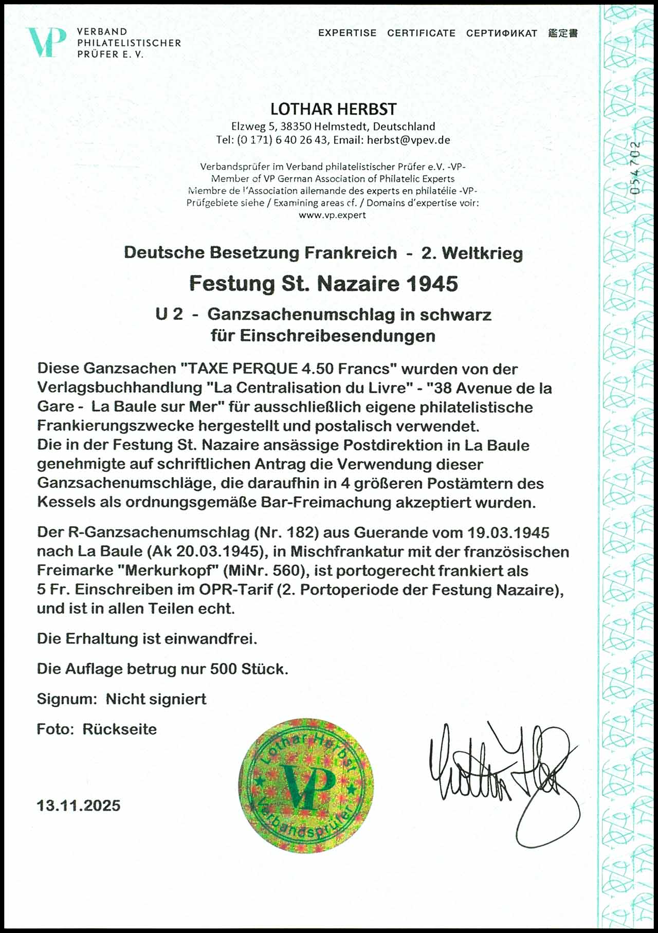 4,50 Fr. Ganzsachenumschlag in schwarz mit Zufrankatur der französischen Freimarke 50 C. Merkurkopf" von "Guerande 19.03.1945" nach La Baule mit Ank.-Stempel vom 20.03.1945, Auflage nur 500 Exemplare, Expertise Lothar Herbst VP (2025) "Die Erhaltung ist einwandfrei."