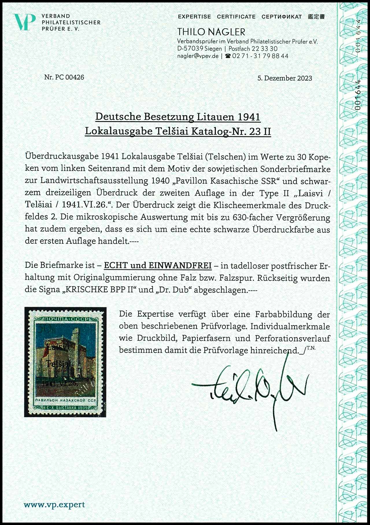 30 Kopeken Landwirtschaftsausstellung "Pavillon Kasachische SSR" mit dreizeiligem Bdr.-Aufdruck in Type II, Druckfeld 2, postfrisch, tadellose Erhaltung, geprüft Krischke BPP, Dr. Dub und Expertise Thilo Nagler VP (2023) "echt und einwandfrei", Mi. 450.- - in dieser Type erzielte eine Marke in unserer 196. Auktion einen Zuschlag von 520.- Euro