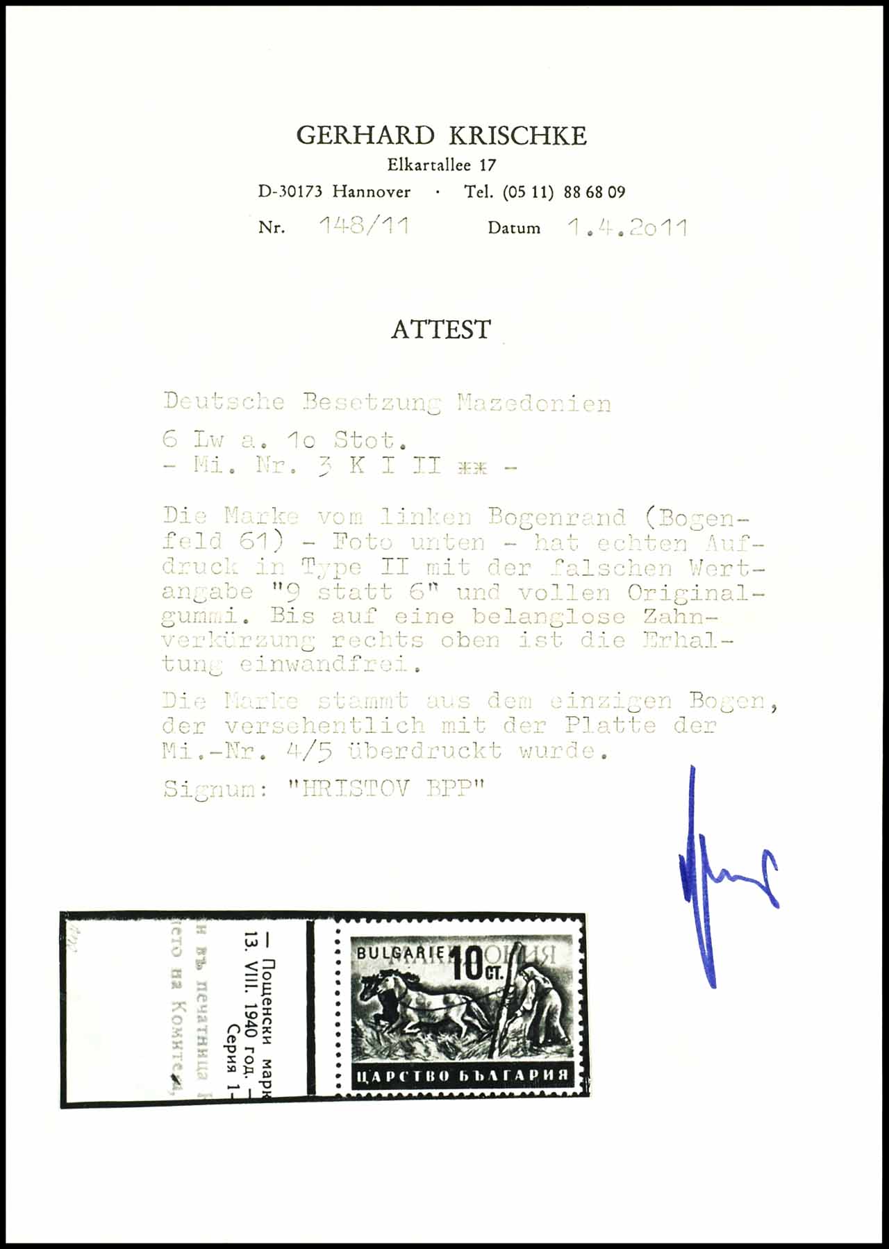 6 L. auf 10 St mit Abart "neuer Wertaufdruck kopfstehend = 9 anstatt 6", postfrisch, seltene Marke, Fotoattest Gerhard Krischke "Bis auf eine belanglose Zahnverkürzung rechts oben ist die Erhaltung einwandfrei.", Mi. 1.000.-