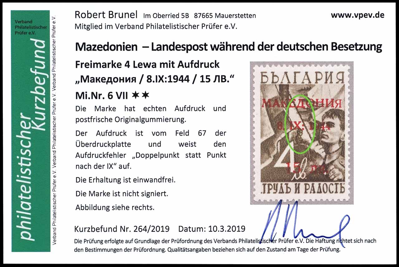 15 L. auf 4 L. Freimarke mit Aufdruckfehler VII "Doppelpunkt statt Punkt nach der IX", Feld 67, postfrisch, tadellose Erhaltung, unsigniert, Fotobefund Robert Brunel VP (2025) "Die Erhaltung ist einwandfrei.", Mi. 200.-
