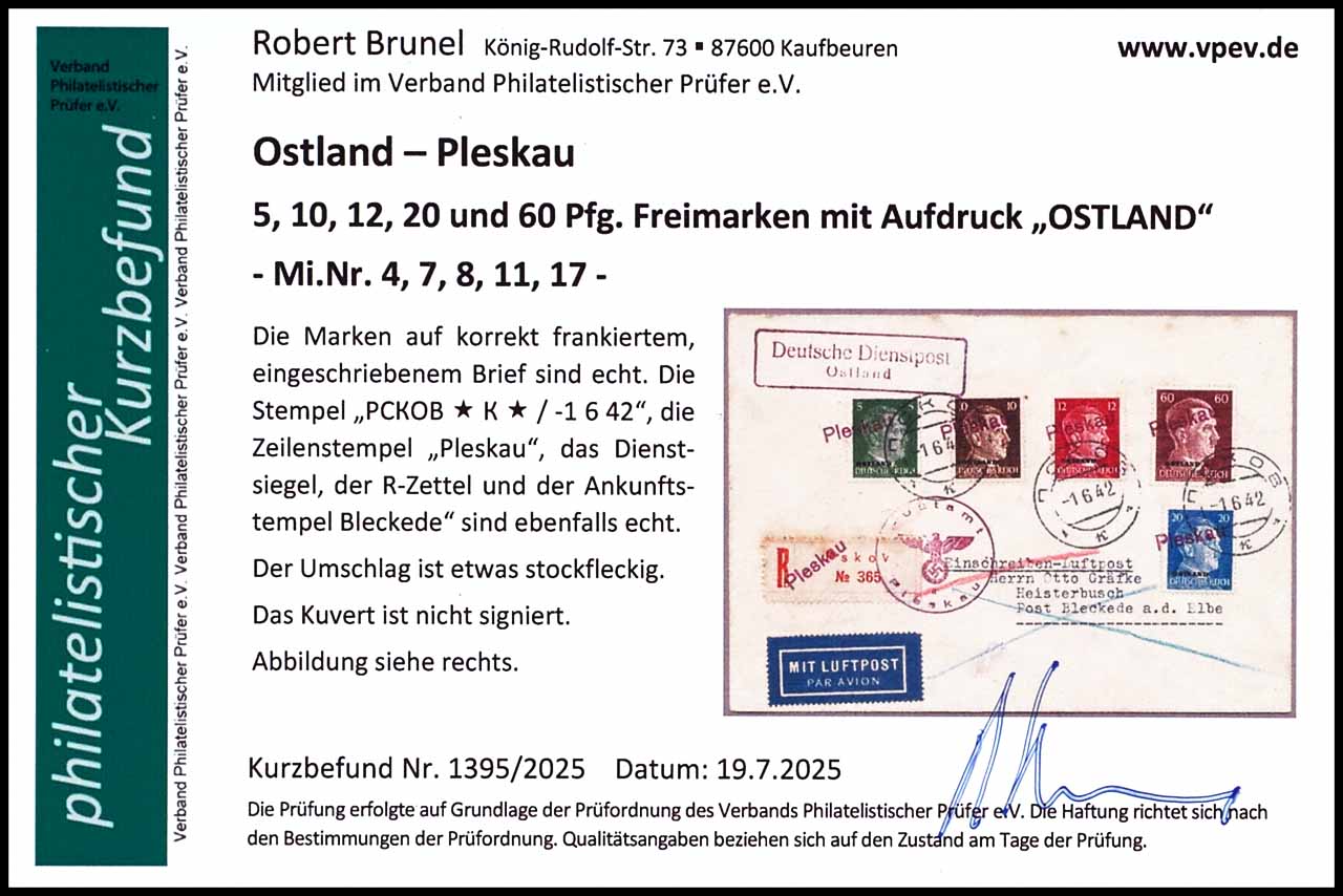 Deutsche Dienstpost Ostland, 5 Pfennig Freimarke mit Aufdruck Ostland in Mischfrankatur mit 10, 12, 20 und 60 Pfennig Freimarken mit Aufdruck Ostland, auf korrekt frankiertem Einschreibe-Luftpostbrief nach Bleckede, Einschreibezettel mit Einzeiler "Pleskau" und Dienstsiegel des Postamts Pleskau, entwertet "PCKOB * K * -1 6 42, rückseitg Ankunftsstempel Bleckede, Fotobefund Robert Brunel VP (2025) "kleine Stockpunkte"