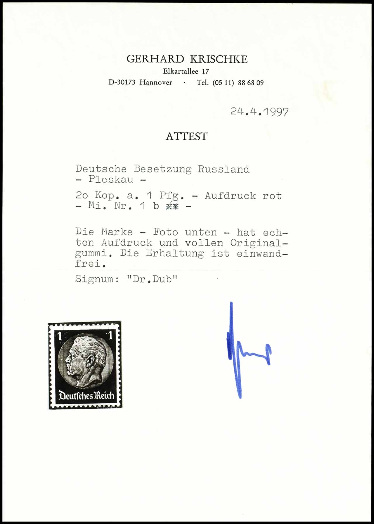 20 Kopeken auf 1 Pfennig Hindenburg, Aufdruck dunkelrosarot, tadellos postfrisch, seltene Marke, Auflage nur 1.150 Stück, geprüft Dr. Dub und Fotoattest Gerhard Krischke "Die Erhaltung ist einwandfrei.", Mi. 550.-