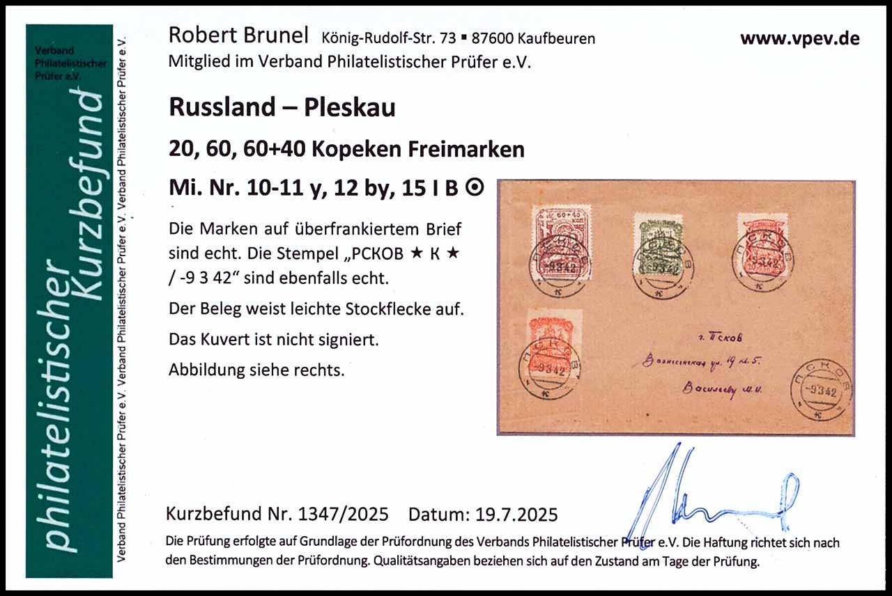 20, 60 und 60+40 Kopeken und MiNr. 15 IB mit Plattenfehler "Glockenturm links beschädigt (Feld5), auf adressiertem Umschlag, entwertet mit Stempel "PCKOB * K * -9 3 42", der Umschlag ist überfrankiert und weist leichte Stockflecke auf, geprüft Zirath, Fotobefund Robert Brunel (VP) 2025