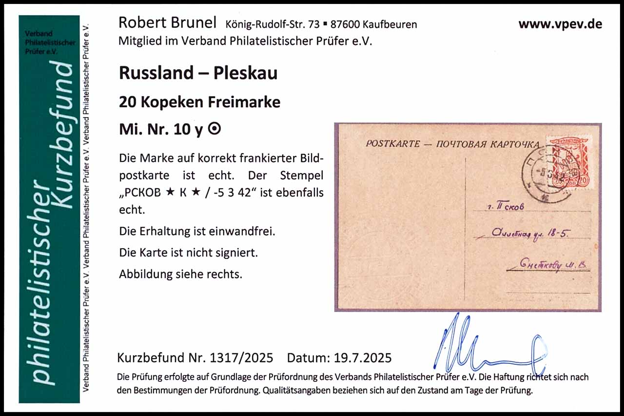 20 Kopeken, MiNr.10y in Einzelfrankatur auf korrekt frankierter Bildpostkarte "Die Kathedrale zur heiligen Dreieinigkeit in Pleskau", entwertet mit Stempel "PCKOB * K * -5 3 42", tadellose Erhaltung, Fotobefund Robert Brunel VP (2025) "Die Erhaltung ist einwandfrei"