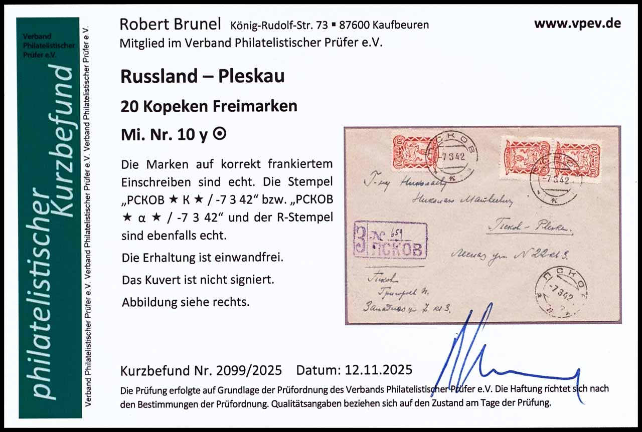 20 Kopeken Mehrfachfrankatur (3) auf korrekt frankiertem Einschreibebrief,Einzelmarke und ein senkrechtes Paaar, entwertet mit Stempel "PCKOB * K * -7 3 42", bzw. "PCKOB * a * -7 3 42", tadellos, Fotobefund Robert Brunel VP (2025), "Die Erhaltung ist einwandfrei"