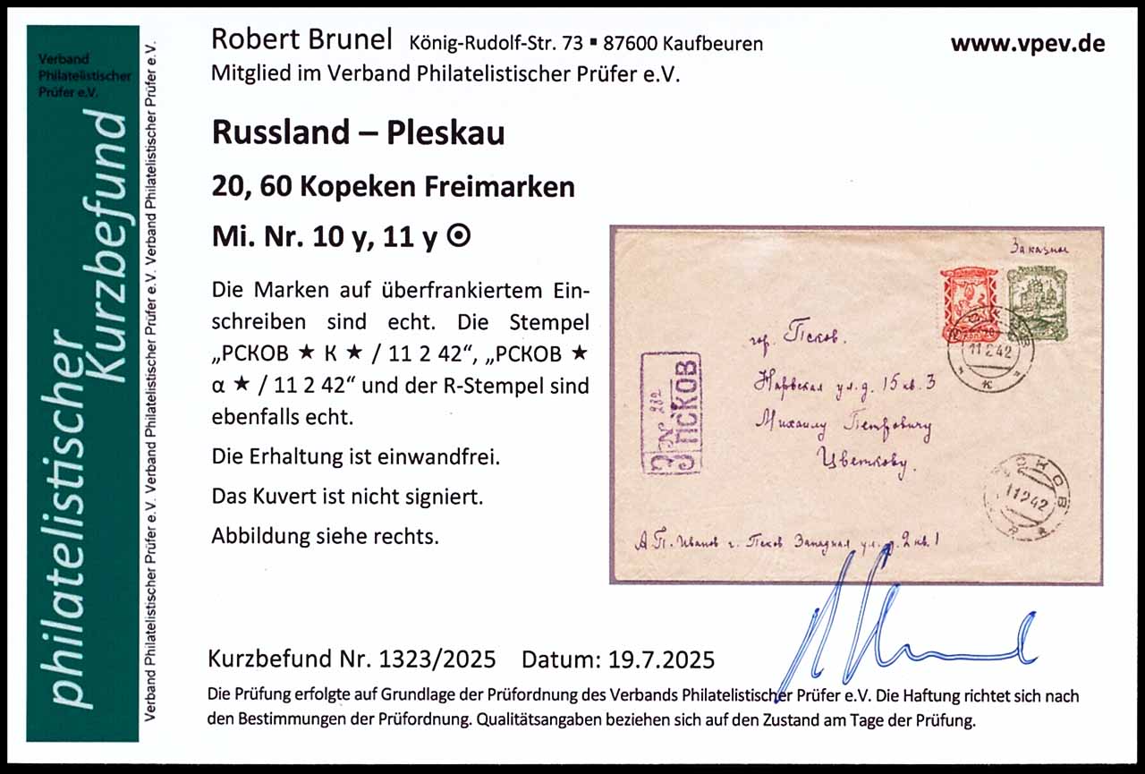 20 und 60 Kopeken in Mischfrankatur auf überfrankiertem und eingeschriebenem Briefumschlag, entwertet mit Stempel "PCKOB * K * 11 2 42" und "PCKOB * a * 11 2 42", tadellose Erhaltung, Fotobefund Robert Brunel VP (2025) "Die Erhaltung ist einwandfrei"