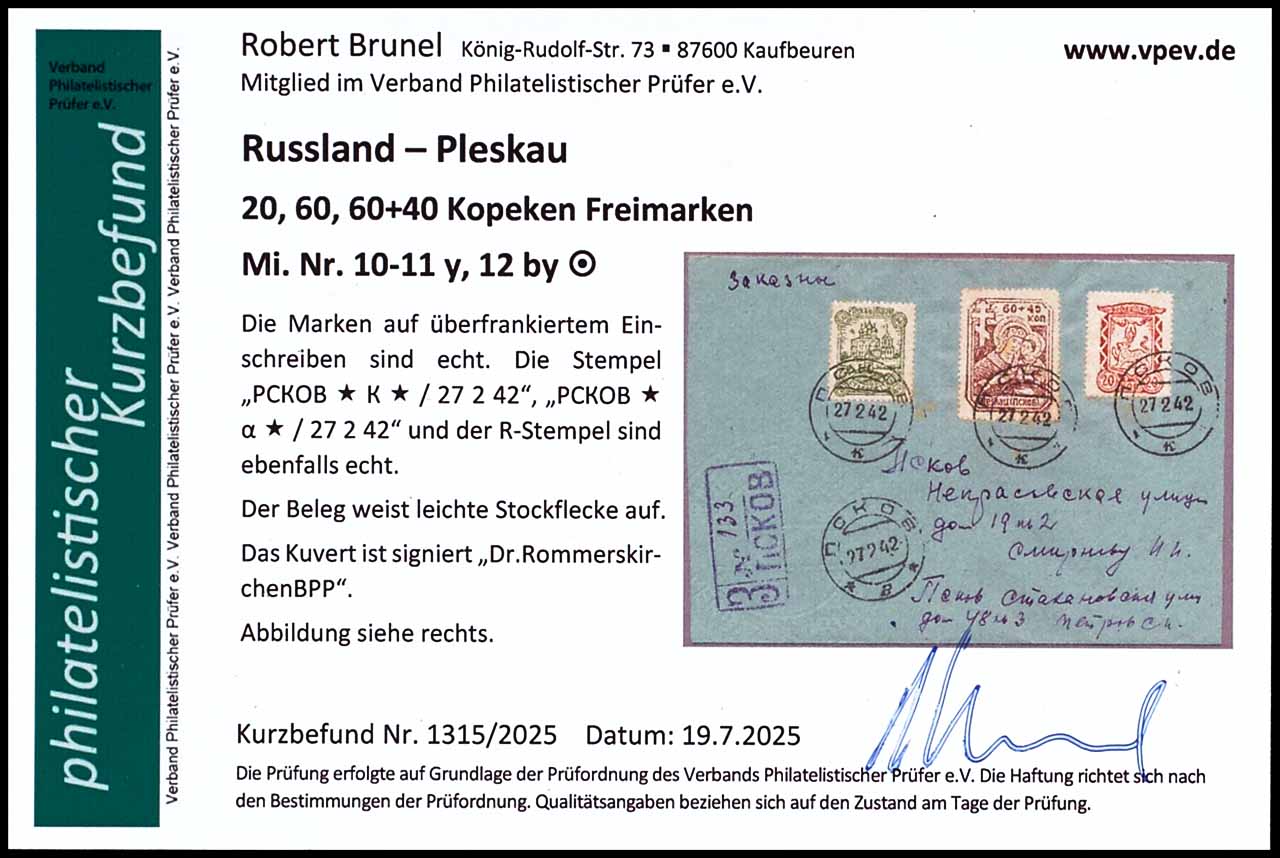 20, 60 und 60+40 Kopeken auf adressiertem, eingeschriebenem Briefumschlag, MiNr. 10y, 11y und 12by, entwertet mit Stempel "PCKOB * K * 27 2 42" und "PCKOB * a * 27 2 42", der Umschlag ist überfrankiert, leichte Stockpunkte und senkrechte Faltung, geprüft Dr. Rommerskirchen BPP, Fotobefund Robert Brunel VP (2025)