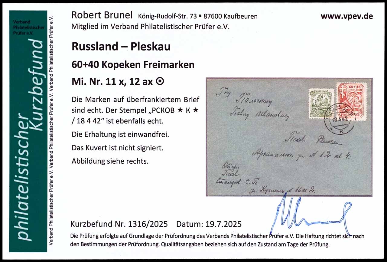 40, und 60+40 Kopeken auf adressiertem, Briefumschlag, MiNr. 11x und 12ax, entwertet mit Stempel "PCKOB * K * 18 4 42", der Umschlag ist überfrankiert, tadellose Erhaltung, Fotobefund Robert Brunel VP (2025)
