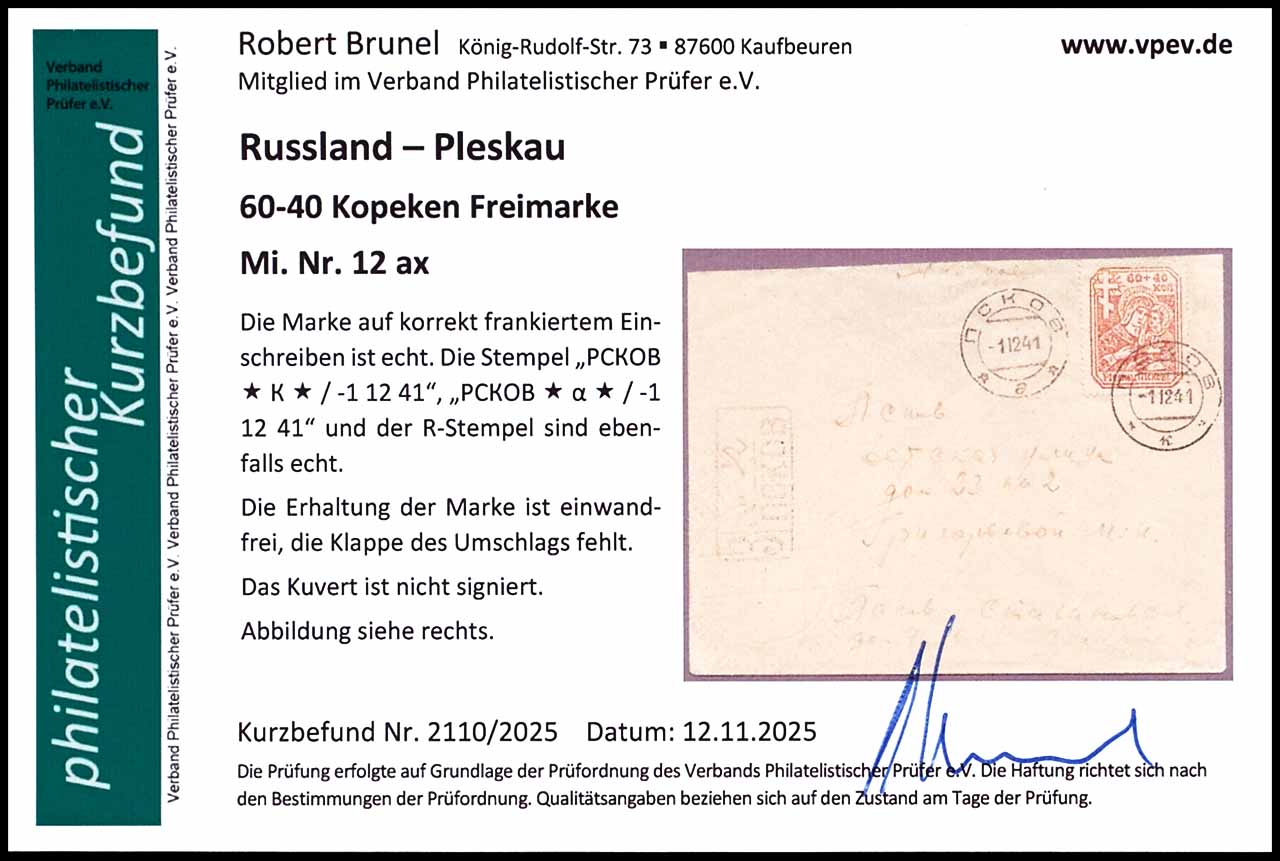 60+40 Kopeken auf korrekt frankiertem Einschreibebrief, entwertet mit Stempel "PCKOB * K * -1 12 41" und "PCKOB * a * -1 12 41), die Klappe des Umschlags fehlt, ansonsten tadellose Erhaltung, Fotobefund Robert Brunel VP (2025), Mi. 100.-