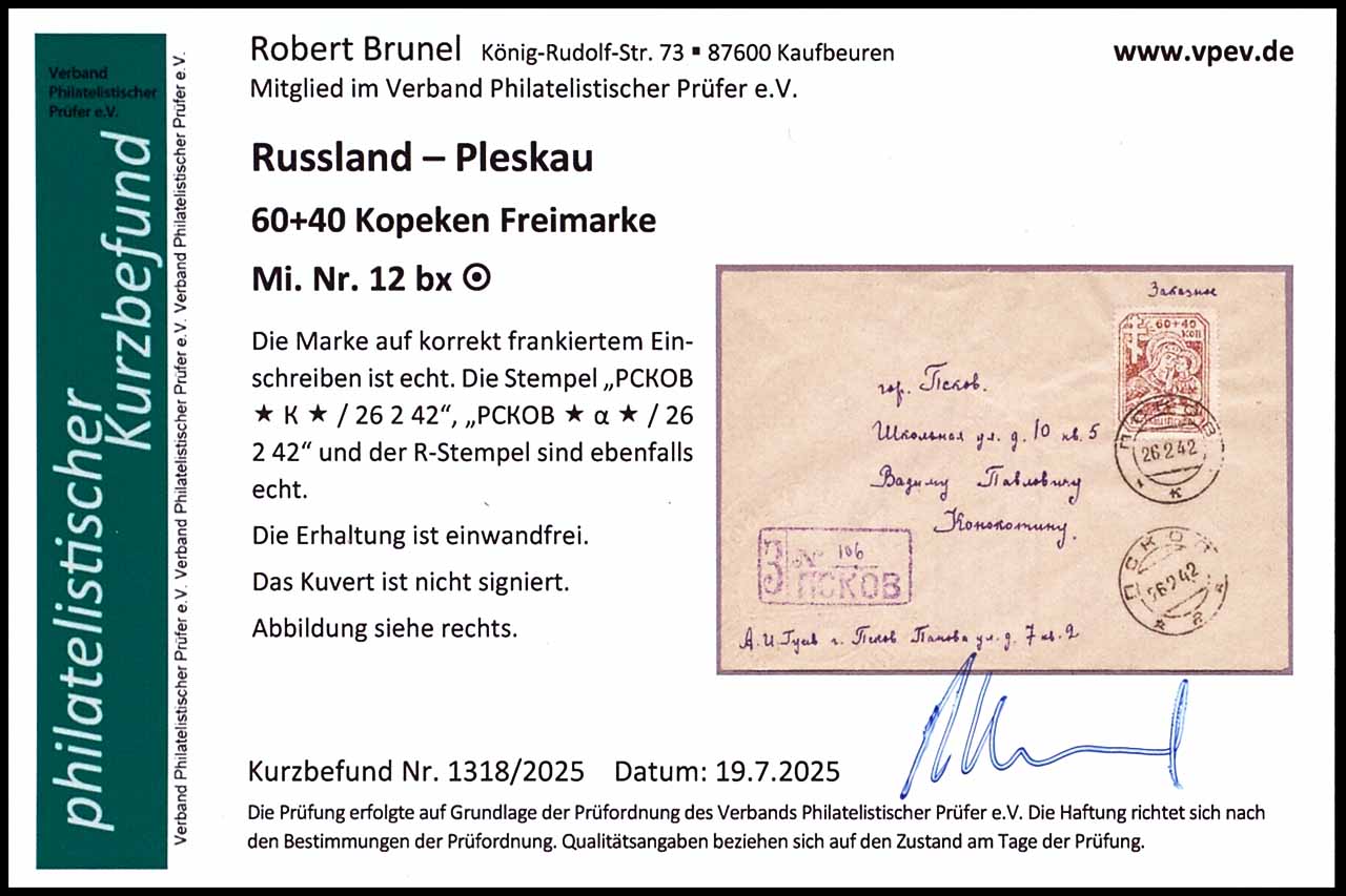 60+40 Kopeken, MiNr.12bx in Einzelfrankatur auf korrekt frankiertem und eingeschriebenem Briefumschlag, inliegend die Aufgabequittung des Einschreibens No. 106, entwertet mit Stempel "PCKOB * K * 26 2 42" und "PCKOB * a * 26 2 42", tadellose Erhaltung, Fotobefund Robert Brunel VP (2025) "Die Erhaltung ist einwandfrei"