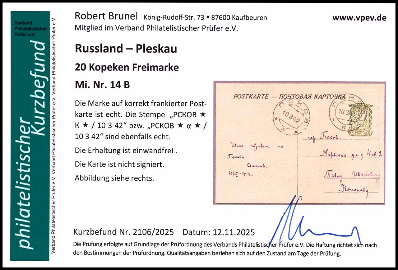 20 Kopeken auf korrekt frankierter Bildpostkarte "Die Kathedarale zur heiligen Dreieinigkeit in Pleskau", entwertet mit Stempel "PCKOB * K * 10 3 42" und "PCKOB * a * 10 3 42", tadellos, Fotobefund Robert Brunel VP (2025) "Die Erhaltung ist einwandfrei", Mi. 150.-