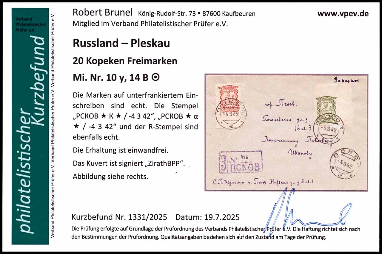 20 Kopeken, Mischfrankatur auf unterfrankiertem und eingeschriebenem Briefumschlag, entwertet mit Stempel "PCKOB * K * -4 3 42 und "PCKOB * a * -4 3 42", tadellose Erhaltung, geprüft Zirath, Fotobefund Robert Brunel VP (2025) "Die Erhaltung ist einwandfrei"