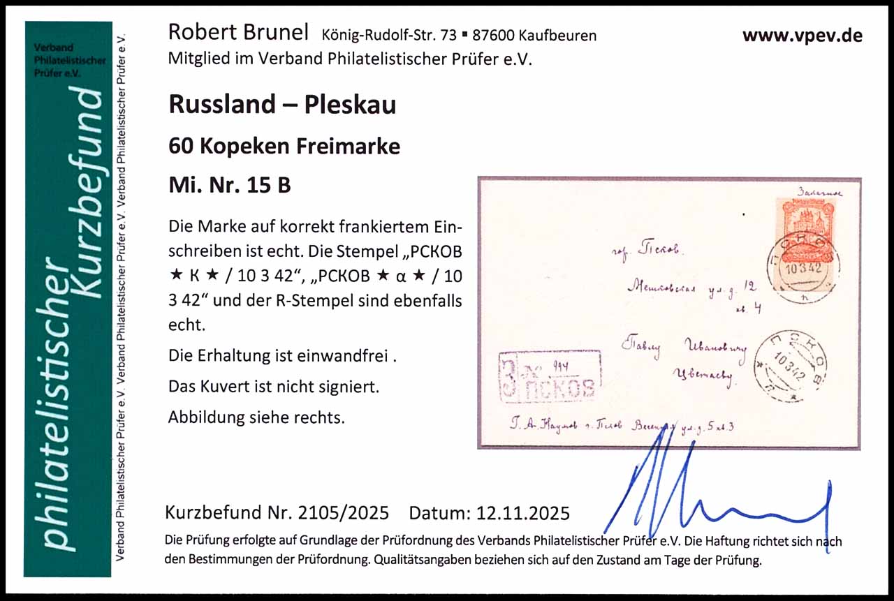 60 Kopeken auf korrekt frankiertem Einschreibebrief, entwertet mit Stempel "PCKOB * K * 10 3 42" und "PCKOB * a * 10 3 42", tadellos, Fotobefund Robert Brunel VP (2025), "Die Erhaltung ist einwandfrei", Mi. 150.-