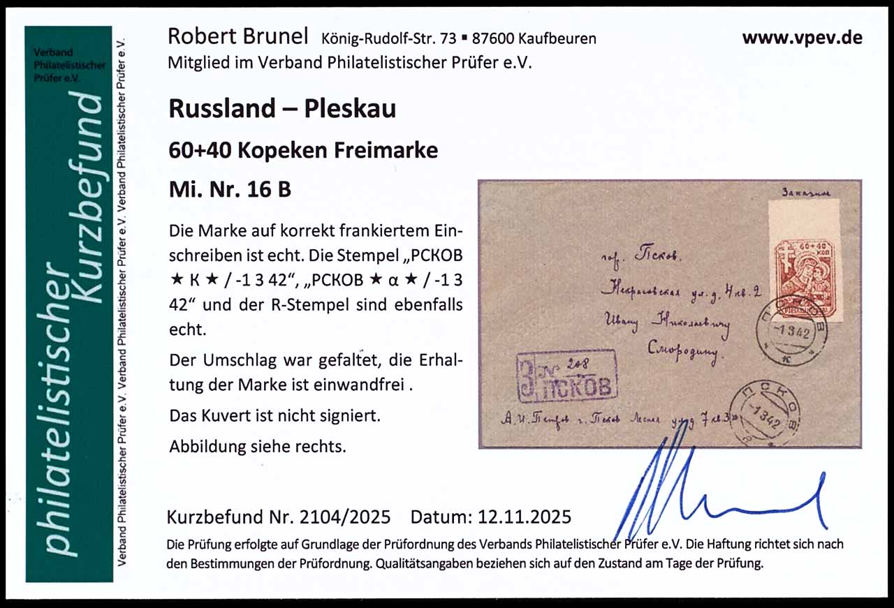 60+40 Kopeken auf korrekt frankiertem Einschreibebrief, entwertet mit Stempel "PCKOB * K * -1 3 42" und "PCKOB * a * -1 3 42", der Umschlag war gefaltet, sehr saubere Erhaltung, Fotobefund Robert Brunel VP (2025), "die Erhaltung der Marke ist einwandfrei", Mi. 300.-