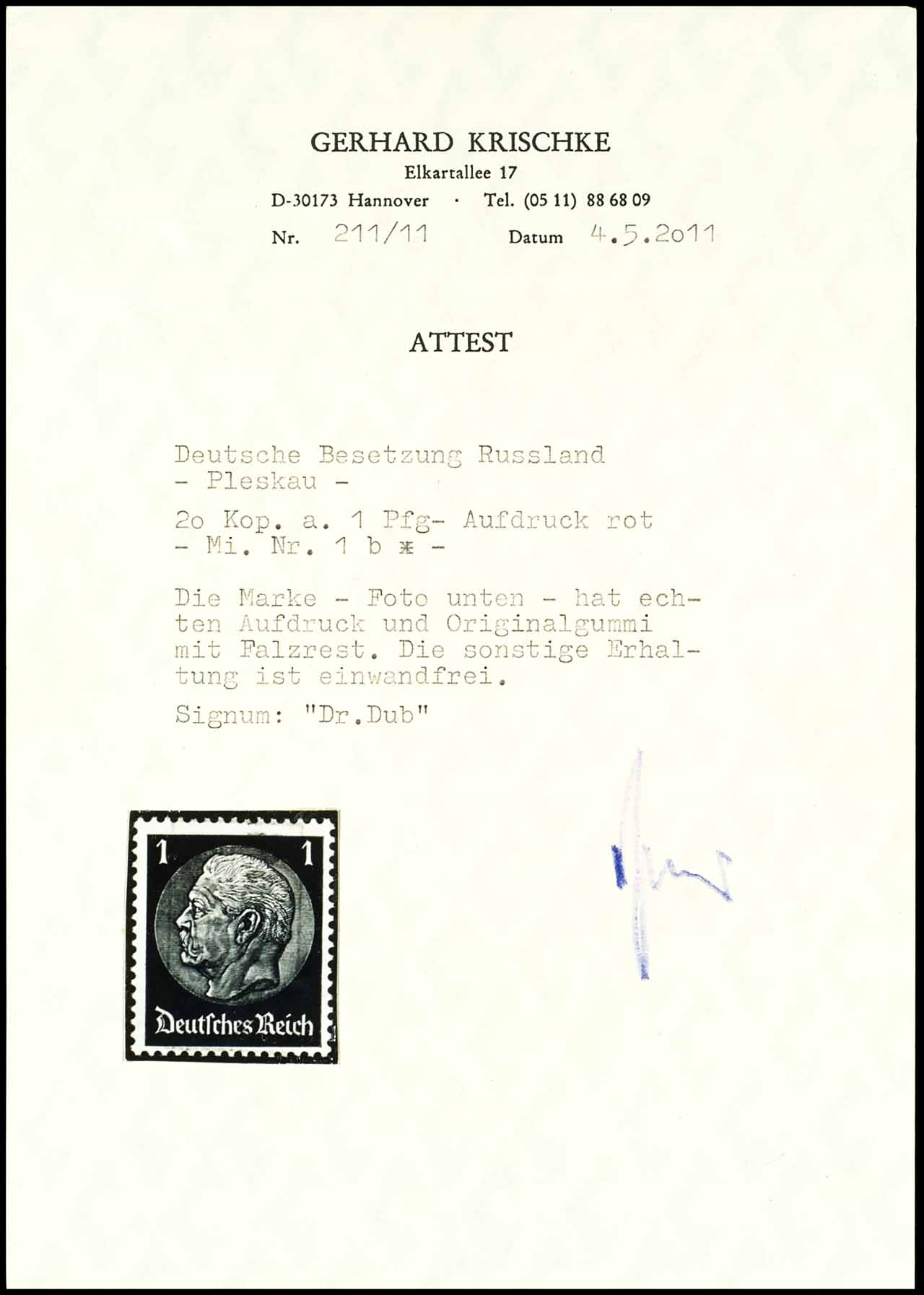 1 Pfennig Hindenburg mit rotem Aufdruck "20 Kop. Pleskau", ungebraucht mit Originalgummierung, tadellose Erhaltung, signiert Dr. Dub und Fotoattest Gerhard Krischke "Die sonstige Erhaltung ist einwandfrei.", Mi. 280.-