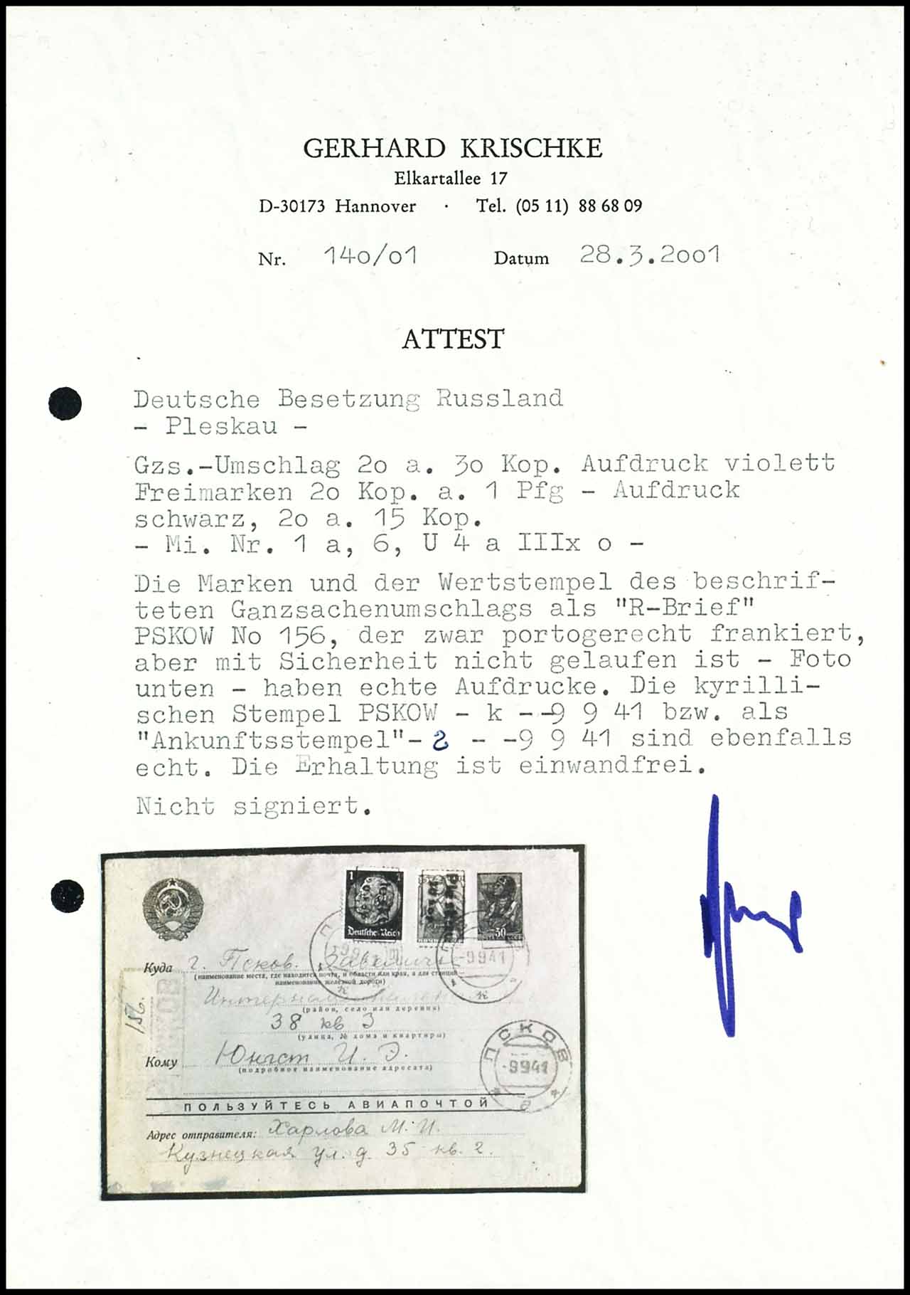 20 Kop. auf 30 Kop. und Freimarken 20 Kop. auf 1 Pfennig "Hindenburg" 20 Kop. auf 15Kop., die Marken und der Wertstempel des beschrifteten Ganzsachenumschlags haben echte Aufdrucke, die kyrillischen Stempel sind ebenfalls echt, portogerechter R-Brief, welcher jedoch mit Sicherheit nicht gelaufen ist, selten, unsigniert und Fotoattest Gerhard Krischke (2001):" Die Erhaltung ist einwandfrei.", Mi.780.-