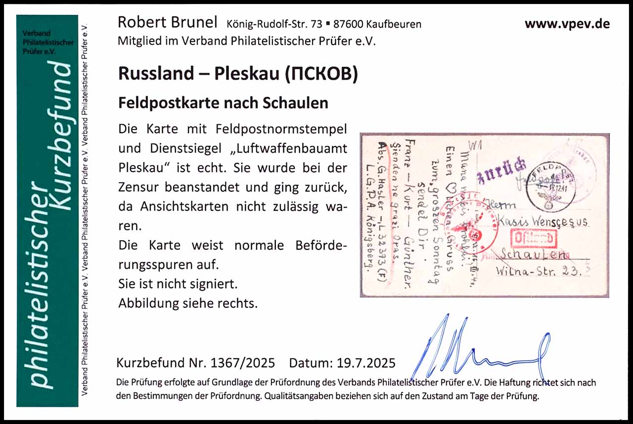 Russland-Pleskau 1941, Ansichtskarte "Fröhliche Weihnachten" für Feldpostzwecke der Deutschen Wehrmacht als Grußkarte nach Schaulen, Luftgaupostamt Königsberg, FePo-Nr. L32393 (F). Dienstsiegelabschlag "Luftwaffenbauamt Pleskau". Von der Zensur der Wehrmacht beanstandet und zurück gesendet, da Ansichtskarten nicht zulässig waren, gute Erhaltung, Ecken bestossen, Eckbug, Fotobefund Robert Brunel VP (2025) "normale Beförderungsspuren"