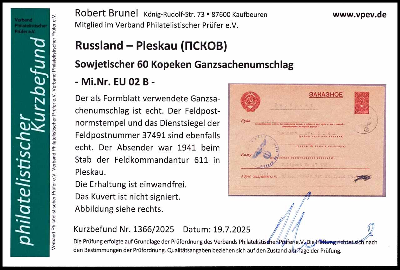 Russland-Pleskau 1941, russischer Ganzsachenumschlag 60 Kopeken, als Formular verwendeter Ganzsachenumschlag für Feldpostzwecke der Deutschen Wehrmacht. Dienstsiegelabschlag Feldpost-Nr. 37491. Absender war beim Stab der Feldpostkommandantur 611 in Pleskau, tadellose Erhaltung, Fotobefund Robert Brunel VP (2025), "Die Erhaltung ist einwandfrei"