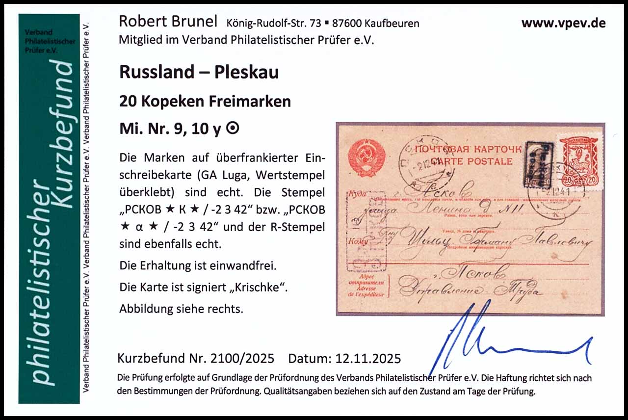 Amtlich nicht genehmigte sowjetrussische Ganzsache mit schrägem Aufdruck "LUGA", überklebt mit Pleskau MiNr. 10y und beifrankiert mit Pleskau MiNr. 9, überfrankierte Einschreibekarte, entwertet mit Stempel "PCKOB * K * -2 3 42" und "PCKOB * a * -2 3 42", tadellos, geprüft Krischke, Fotobefund Robert Brunel VP (2025), "Die Erhaltung ist einwandfrei"