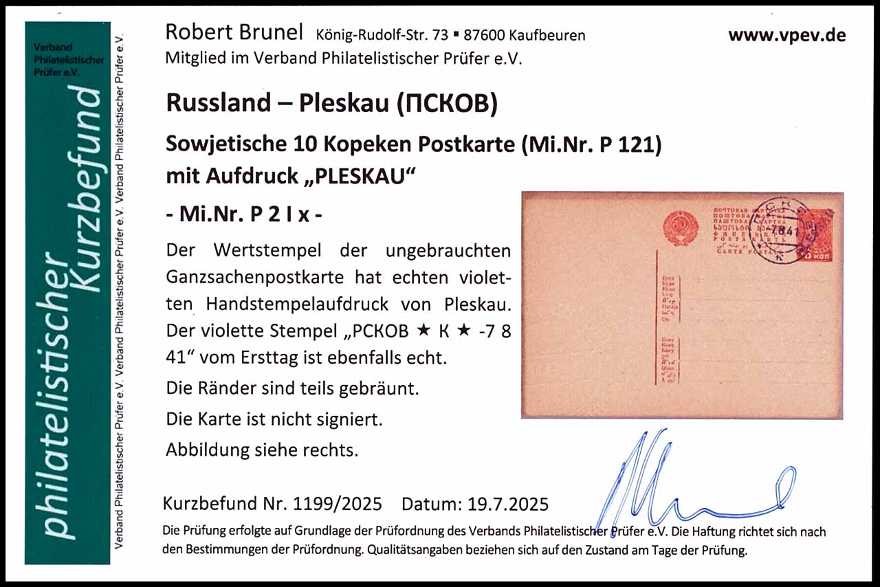 10 Kopeken Ganzsachenpostkarte mit Aufdruck "PLESKAU", violetter Handstempelaufdruck, Blankokarte, entwertet mit violettem Stempel "PCKOB * K * -7 8 41" vom Ersttag, Ränder teilweise etwas gebräunt, Fotobefund Robert Brunel VP (2025)