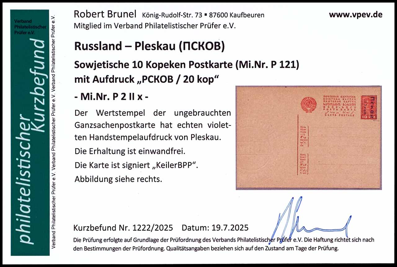 10 Kopeken Ganzsachenpostkarte mit Aufdruck "PLESKAU/20 kop", violetter Handstempelaufdruck, Blankokarte, ungebraucht, tadellose Erhaltung, Fotobefund Robert Brunel VP (2025), geprüft Keiler BPP