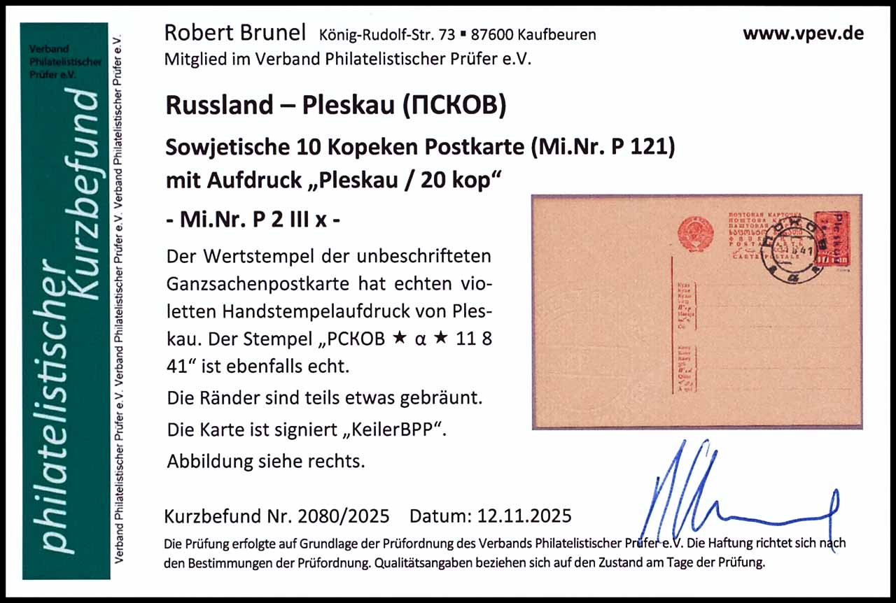 10 Kopeken Ganzsachenkarte mit violettem Aufdruck " Pleskau 20 kop", Blankokarte, entwertet mit Stempel PCKOB * a * 11 8 41", Ränder teilweise etwas gebräunt, geprüft Keiler BPP, Fotobefund Robert Brunel VP (2025)