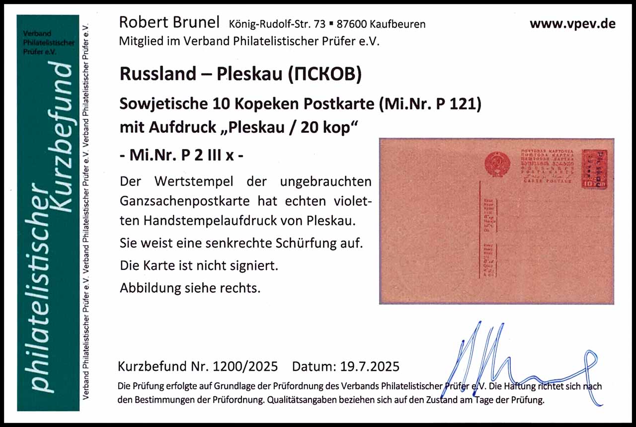 10 Kopeken Ganzsachenpostkarte mit Aufdruck "PLESKAU/ 20 kop", violetter Handstempelaufdruck, Blankokarte, ungebraucht, senkrechte Schürfspur, Fotobefund Robert Brunel VP (2025)