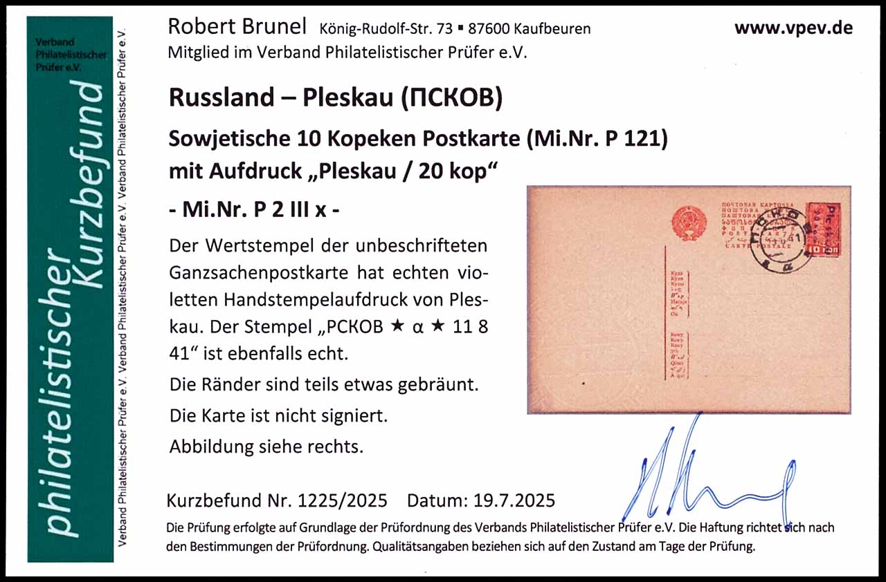 10 Kopeken Ganzsachenpostkarte mit Aufdruck "PLESKAU/ 20 kop", violetter Handstempelaufdruck, Blankokarte, entwertet mit Stempel "PCKOB * a * 11 8 41", Ränder teilweise etwas gebräunt, Fotobefund Robert Brunel VP (2025)