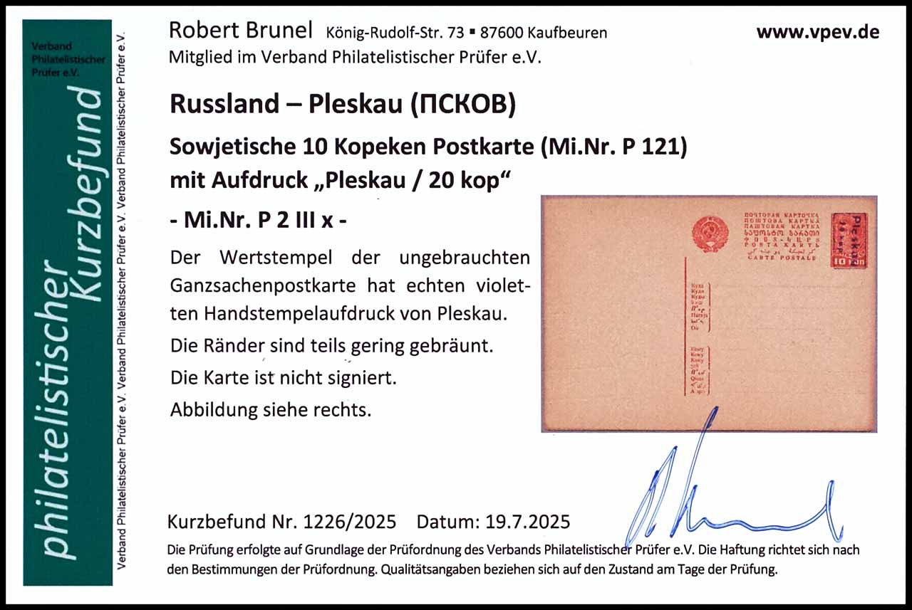 10 Kopeken Ganzsachenpostkarte mit Aufdruck "PLESKAU/ 20 kop", violetter Handstempelaufdruck, Blankokarte, ungebraucht, Ränder teilweise etwas gebräunt, Fotobefund Robert Brunel VP (2025)