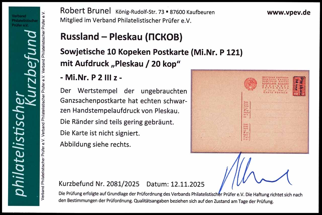 10 Kopeken Ganzsachenkarte mit schwarzem Aufdruck " Pleskau 20 kop", ungebraucht, Ränder teilweise etwas gebräunt, Fotobefund Robert Brunel VP (2025)