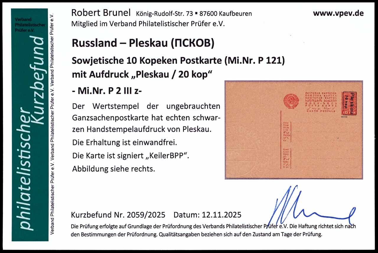 10 Kopeken Ganzsachenpostkarte mit Aufdruck " Pleskau/ 20 kop", ungebraucht, tadellos, geprüft Keiler BPP, Fotobefund Robert Brunel VP (2025) "Die Erhaltung ist einwandfrei"