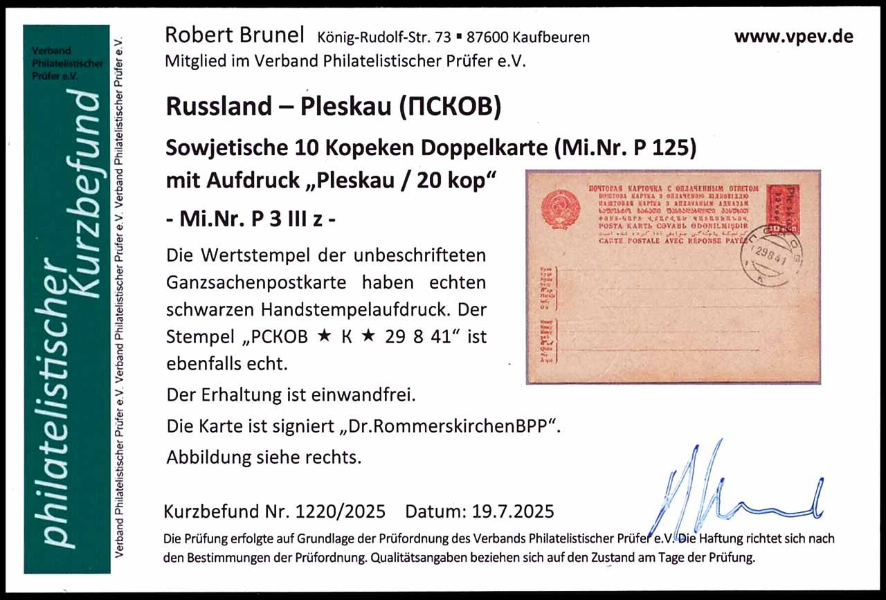 10 Kopeken Doppel-Ganzsachenpostkarte mit Aufdruck "PLESKAU/20 kop", violetter Handstempelaufdruck, Blankokarte, die Fragekarte ist entwertet "PCKOB * K * 29 8 41, tadellose Erhaltung, Fotobefund Robert Brunel VP (2025), "Die Erhaltung ist einwandfrei, geprüft Dr. Rommerskirchen BPP
