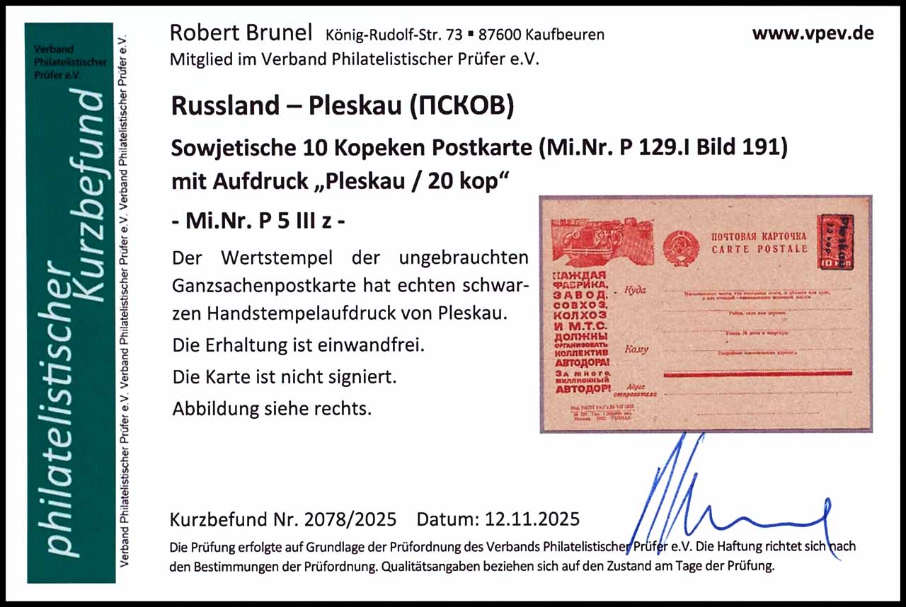10 Kopeken Ganzsachenkarte mit schwarzem Aufdruck " Pleskau 20 kop", links mit Werbung Automobil, ungebraucht, tadellos, Fotobefund Robert Brunel VP (2025) "Die Erhaltung ist einwandfrei"