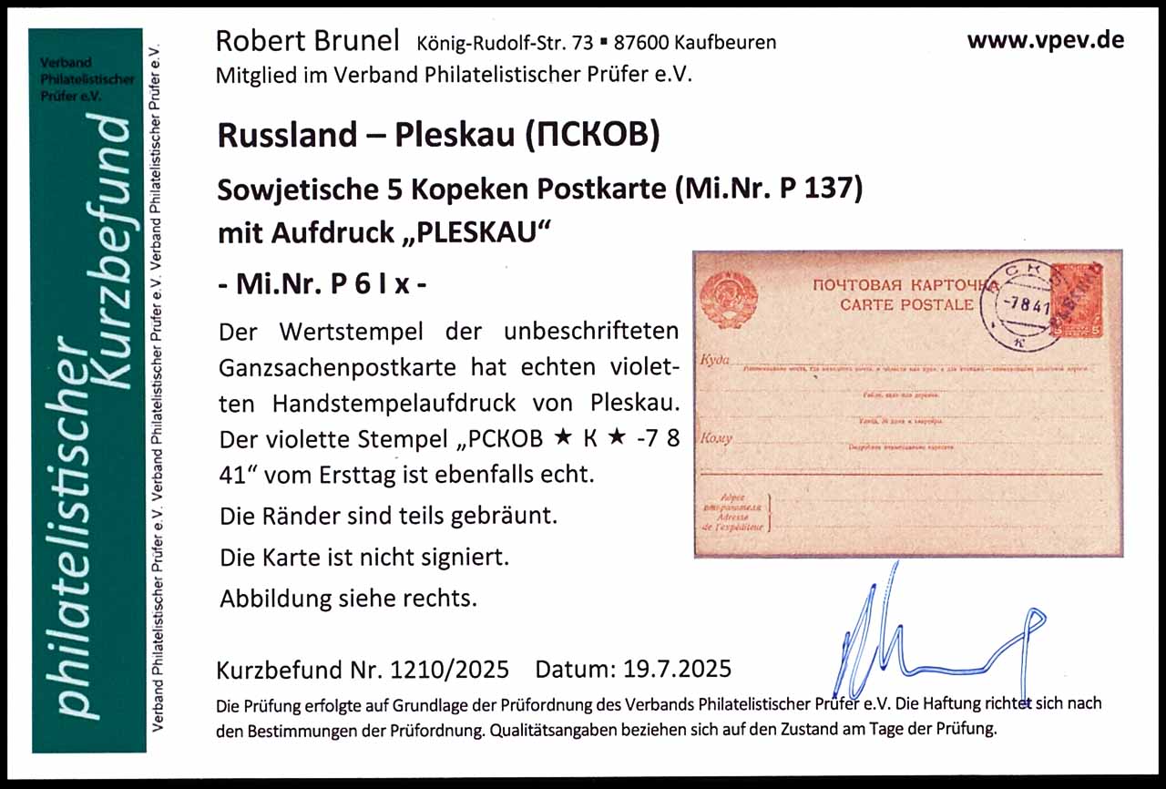 5 Kopeken Ganzsachenpostkarte mit Aufdruck "PLESKAU", violetter Handstempelaufdruck, Blankokarte, entwertet mit violettem Stempel "PCKOB * K * -7 8 41" vom Ersttag, Ränder teilweise etwas gebräunt, Eckbug rechts unten, Fotobefund Robert Brunel VP (2025)