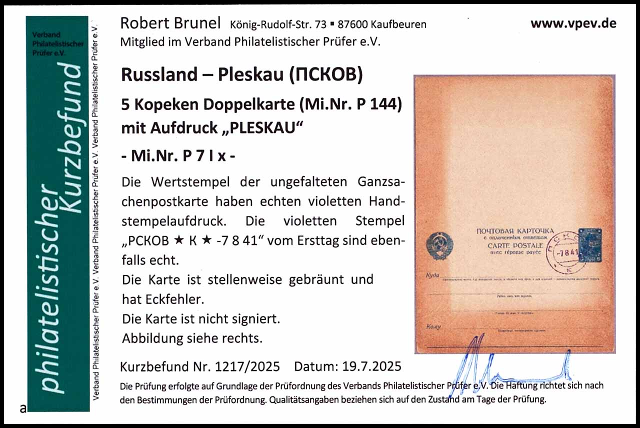 5 Kopeken Doppel-Ganzsachenpostkarte, ungefaltet, mit Aufdruck "PLESKAU", violetter Handstempelaufdruck, Blankokarte, nur die Fragekarte entwertet mit violettem Stempel "PCKOB * K * -7 8 41" vom Ersttag, teilweise gebräunt, Ecken bestossen und bügig, Fotobefund Robert Brunel VP (2025)