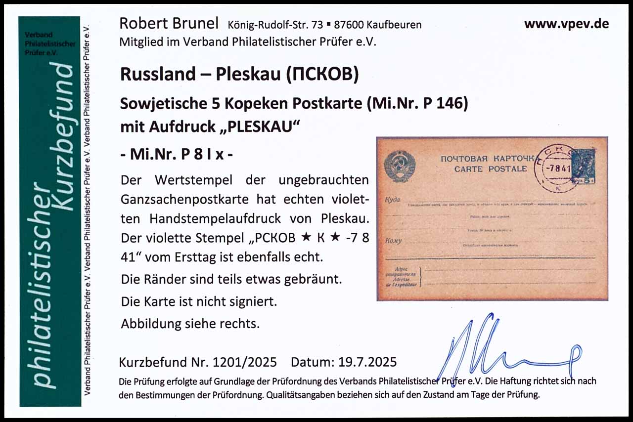 5 Kopeken Ganzsachenpostkarte mit Aufdruck "PLESKAU", violetter Handstempelaufdruck, Blankokarte, entwertet mit violettem Stempel "PCKOB * K * -7 8 41" vom Ersttag, Ränder teilweise etwas gebräunt, Fotobefund Robert Brunel VP (2025)