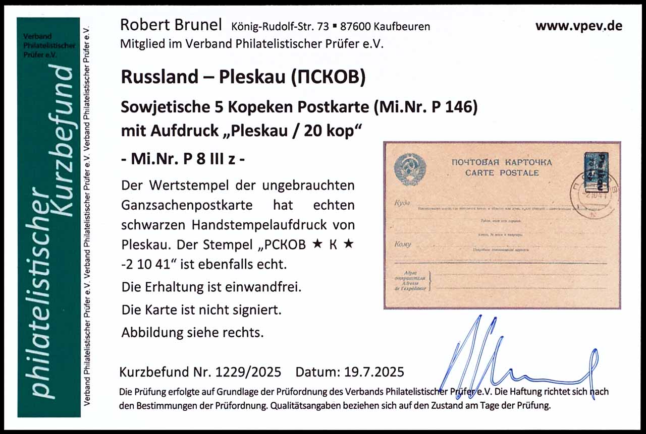 5 Kopeken Ganzsachenpostkarte mit Aufdruck "PLESKAU", schwarzer Handstempelaufdruck, Blankokarte, entwertet mit violettem Stempel "PCKOB * K * -2 10 41", tadellos, Fotobefund Robert Brunel VP (2025) "Die Erhaltung ist einwandfrei"