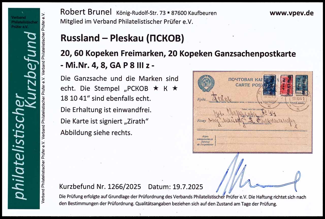 5 Kopeken Ganzsachenpostkarte mit Aufdruck "PLESKAU/ 20 kop", schwarzer Handstempelaufdruck und Zusatzfrankatur Pleskau MiNr. 4 und 8, adressiert, nur frontseitig beschriftet, entwertet mit schwarzem Stempel "PCKOB * K * -18 10 41", tadellos, Fotobefund Robert Brunel VP (2025) "Die Erhaltung ist einwandfrei", geprüft Zirath