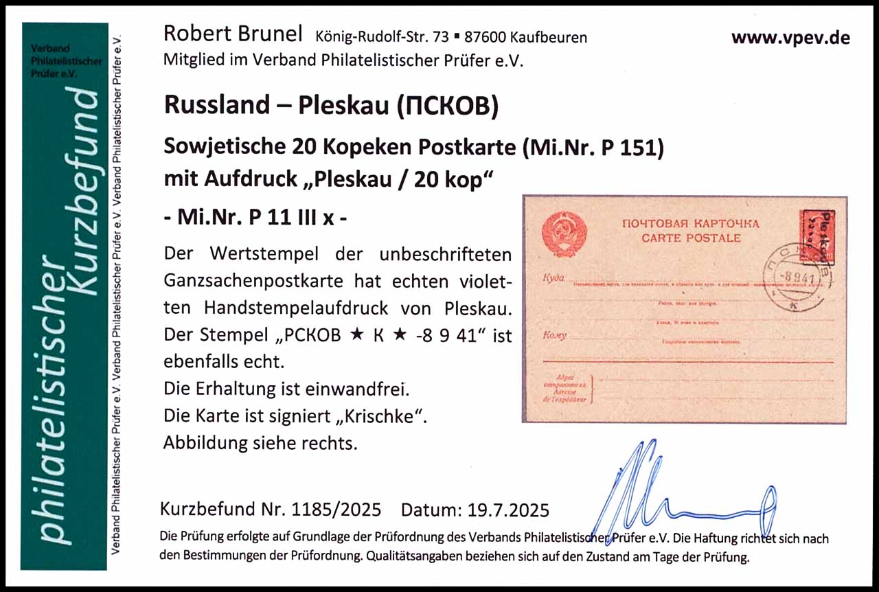 20 Kopeken Ganzsachenpostkarte mit Aufdruck " Pleskau/ 20 kop", violetter Handstempelaufdruck, Blankokarte, entwertet mit Stempel "PCKOB * K * -8 9 41", tadellose Erhaltung, geprüft Krischke, Fotobefund Robert Brunel VP (2025), "Die Erhaltung ist einwandfrei"