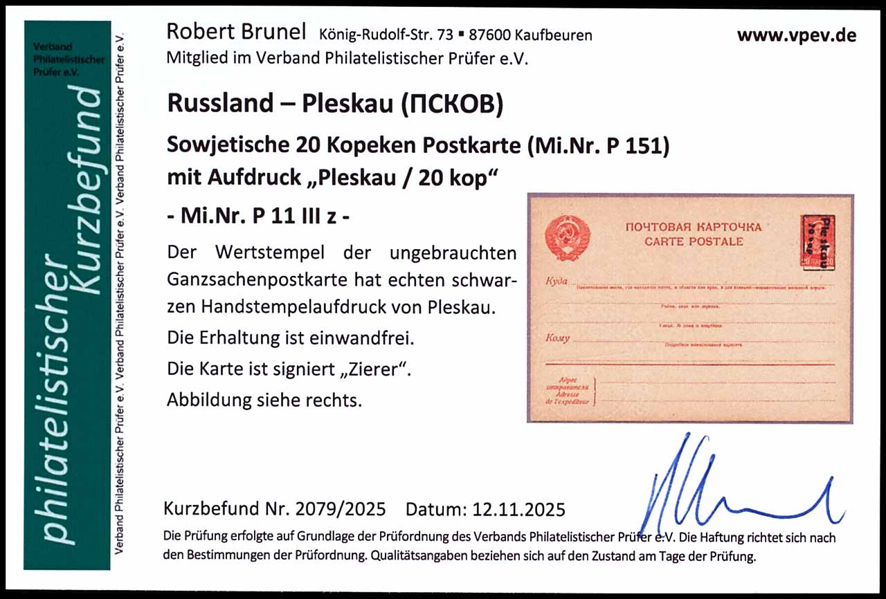 20 Kopeken Ganzsachenkarte mit schwarzem Aufdruck " Pleskau 20 kop", ungebraucht, tadellos, geprüft Zierer, Fotobefund Robert Brunel VP (2025), "Die Erhaltung ist einwandfrei"