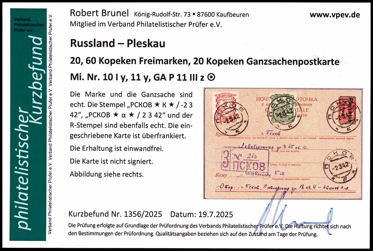 20 Kopeken eingeschriebene Ganzsachenpostkarte mit Aufdruck " Pleskau/ 20 kop", schwarzer Handstempelaufdruck, mit Zusatzfrankatur Pleskau MiNr. 10Iy und 11y, entwertet mit Stempel "PCKOB * K * -2 3 42" , überfrankiert, Fotobefund Robert Brunel VP (2025) "Die Erhaltung ist einwandfrei."