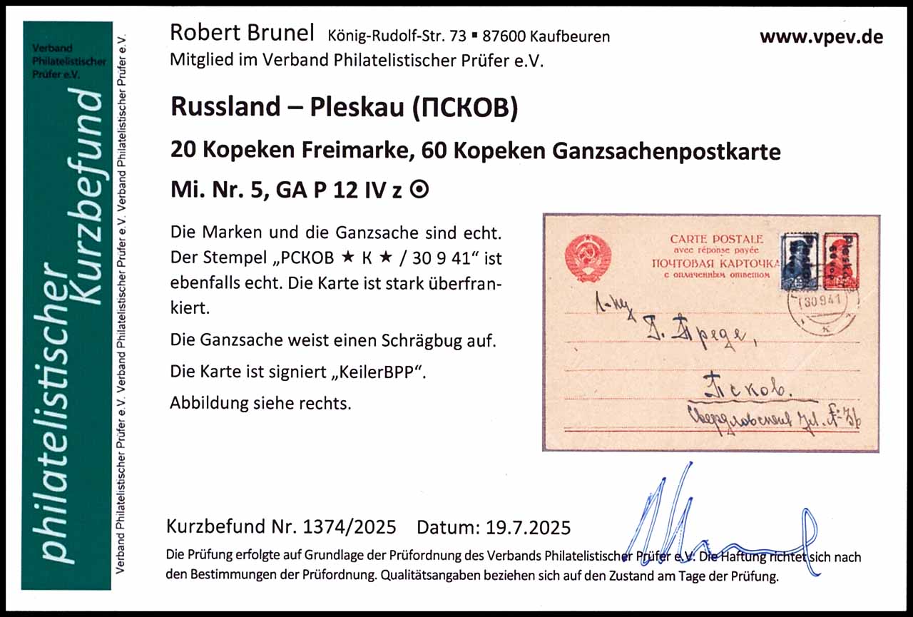 30 Kopeken Ganzsachenpostkarte mit Aufdruck "Pleskau/ 60 kop", schwarzer Handstempelaufdruck, adressiert, mit Zusatzfrankatur Pleskau MiNr. 5, entwertet mit Stempel "PCKOB * K * 30 9 41", Karte ist stark überfrankiert, Schrägbug rechts, Fotobefund Robert Brunel VP (2025), geprüft Keiler BPP