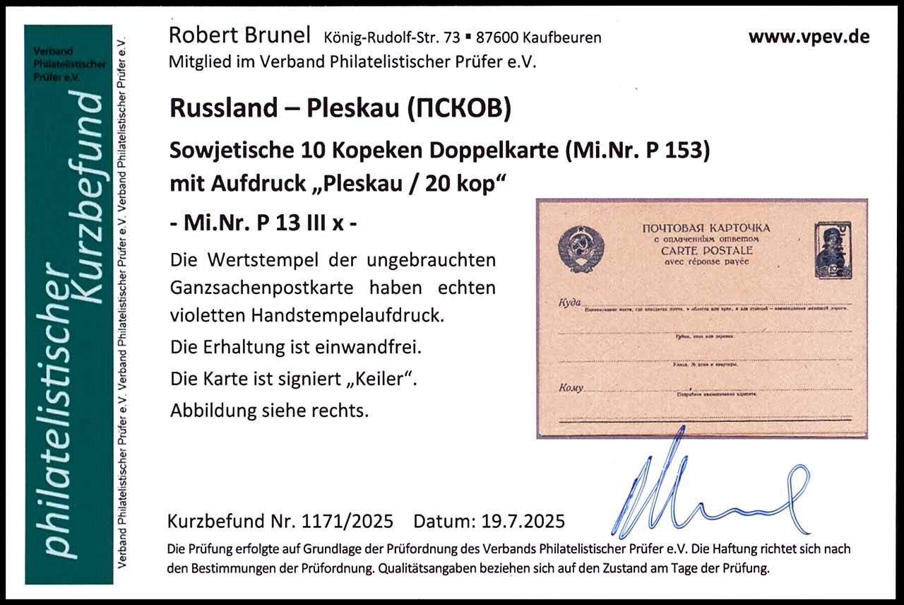 10 Kopeken Doppel-Ganzsachenpostkarte, gefaltet mit Aufdruck "Pleskau/20 kop", violetter Handstempelaufdruck, ungebraucht, tadellose Erhaltung, Fotobefund Robert Brunel VP (2025) "Die Erhaltung ist einwandfrei", geprüft Keiler BPP