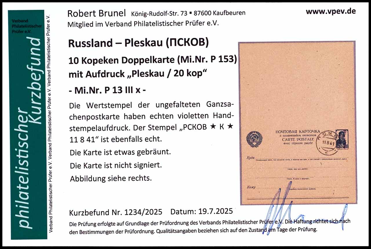 10 Kopeken Doppel-Ganzsachenpostkarte, ungefaltet, mit Aufdruck "PLESKAU/ 20 kop", violetter Handstempelaufdruck, Blankokarte, die Fragekarte ist entwertet mit Stempel "PCKOB * K * 11 8 41, die Karte ist etwas gebräunt, Fotobefund Robert Brunel VP (2025)