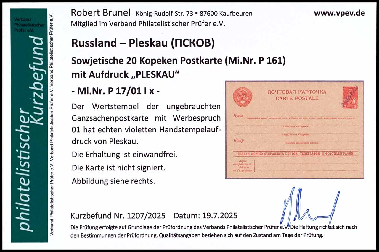 20 Kopeken Ganzsachenpostkarte mit Aufdruck "PLESKAU", mit Werbespruch 05, violetter Handstempelaufdruck, Blankokarte, ungebraucht, tadellose Erhaltung, Fotobefund Robert Brunel VP (2025), "Die Erhaltung ist einwandfrei"