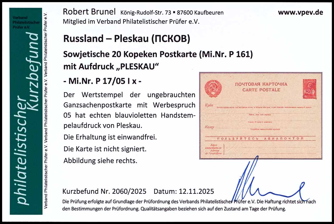20 Kopeken Ganzsachenpostkarte mit violettem Aufdruck " PLESKAU", ungebraucht, mit Werbespruch05, tadellos, Fotobefund Robert Brunel VP (2025) "Die Erhaltung ist einwandfrei", Mi.175.-