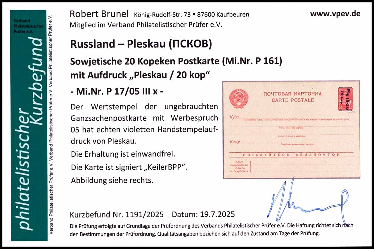 20 Kopeken Ganzsachenpostkarte mit Aufdruck "Pleskau/20 kop", mit Werbespruch 05, violetter Handstempelaufdruck, ungebraucht, tadellose Erhaltung, geprüft Keiler BPP, Fotobefund Robert Brunel VP (2025), "Die Erhaltung ist einwandfrei"