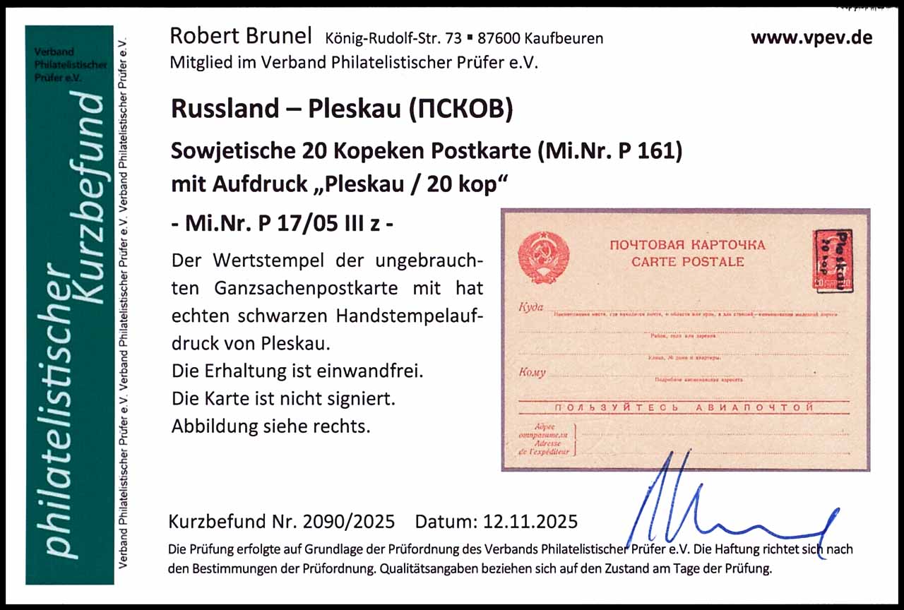 20 Kopeken Ganzsachenkarte mit schwarzem Aufdruck "Pleskau 20 kop", mit Werbespruch05, ungebraucht, tadellos, Fotobefund Robert Brunel VP (2025) "Die Erhaltung ist einwandfrei"
