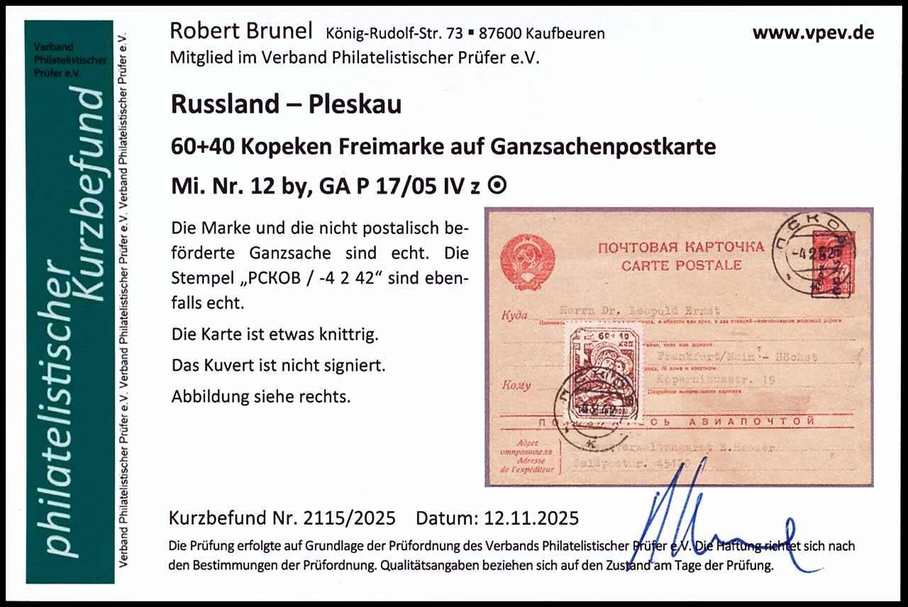 20 Kopeken Ganzsachenkarte mit schwarzem Aufdruck "Pleskau 60 kop", mit Werbespruch05, mit Zusatzfrankatur Pleskau MiNr. 12by, nicht postalisch befördert, entwertet mit Stempel "PCKOB * K * -4 2 42", Karte ist etwas knittrig, Fotobefund Robert Brunel VP (2025)