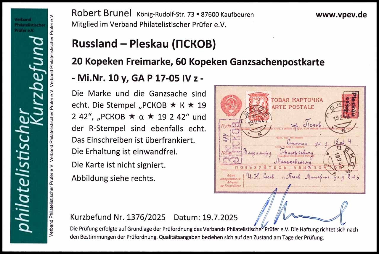 20 Kopeken eingeschriebene Ganzsachenpostkarte mit Aufdruck "Pleskau/60 kop", mit Werbespruch 05, schwarzer Handstempelaufdruck, mit Zusatzfrankatur, Pleskau MiNr. 10y, entwertet "PCKOB * K * 19 2 42" und "PCKOB * a * 19 2 42", tadellose Erhaltung, Einschreiben ist überfrankiert, Fotobefund Robert Brunel VP (2025) "Die Erhaltung ist einwandfrei."